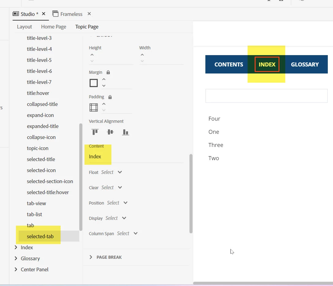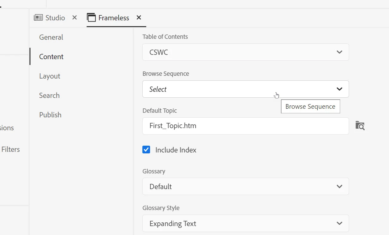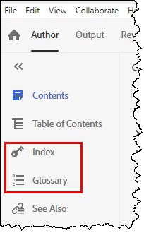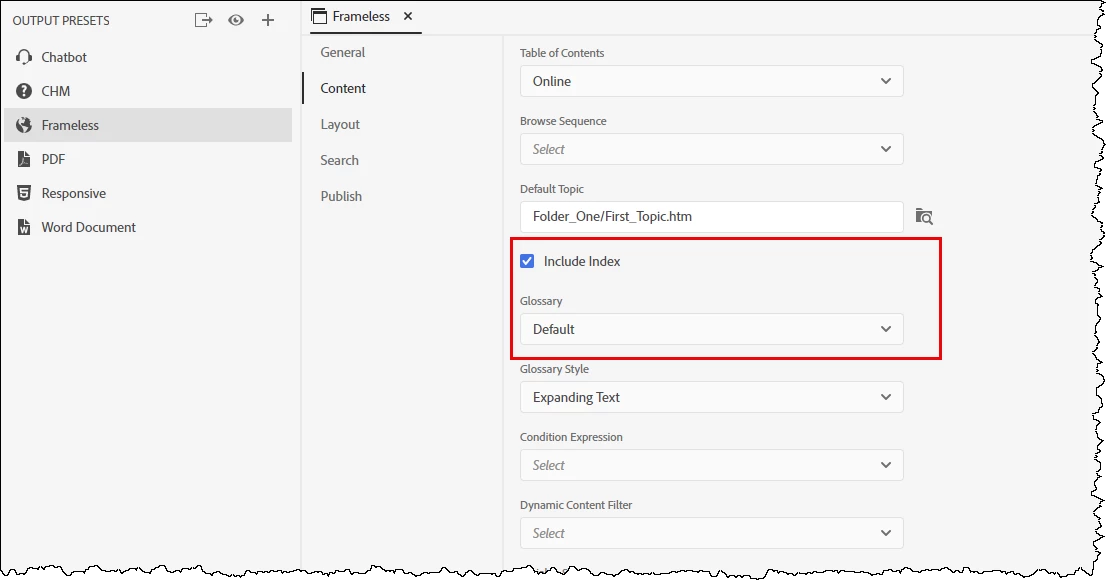 Here I have selected both options but as I haven't set up any glossary terms, RoboHelp is not including the tab.