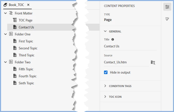 My desire is to have my RH Project produce a PDF that starts with a Cover page then has a Contact Us page then the TOC followed by the actual content. However I do not need or want the Contact Us page to appear in the TOC. For some reason no matter how hard or how many times I check the "Hide in output" checkbox for the Contact Us page it still appears in the TOC. Is that option more of an emotional support checkbox or something? I have even examined the xml of the TOC and saw processing-role="resource-only" for the specific page, but it still gets listed in the TOC. I even took a sample RH project (Two Cover Pages one) from a post by Peter Grainge, changed the TOC to Book, added the TOC to the Front Matter and it shows the CoverPage2 in the TOC. In the below example both CoverPage2 and First Topic are set to processing-role="resource-only" or "Hide in output" option from the UI.