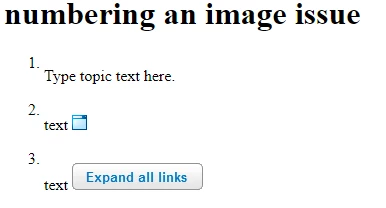 I am attempting to create ordered lists where occaionally an item will contain an in-line image. When I add the image, the line of text automatically moves down to accomodate the space, leaving the number in its usual position.