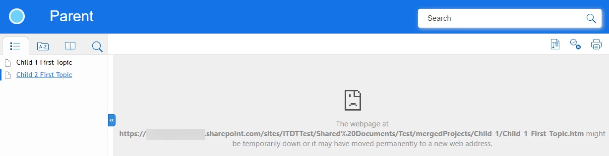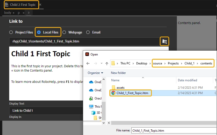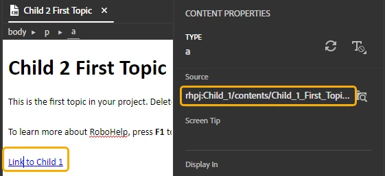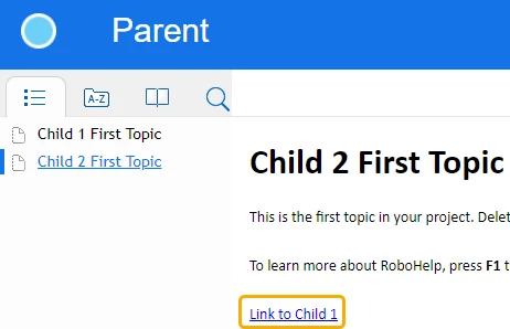 What is the correct way to link a topic from one child project to a different child project? I tried to link a Topic from Child2 to Child1 by selecting the text in Child1 and clicking Hyperlink > Local Files > MyRobohelpProjects > Child2 > topic. When I generate the Responsive HTML merged output from the Parent, I get a 'page may have been moved or deleted' message after I click the Hyperlink in Child1. Right-clicking the contents pane and choosing Link > Link File linked the topic but none of the images appeared in the merged output.