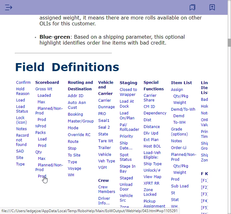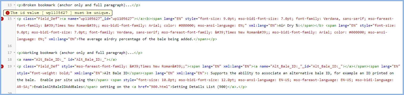 Or could it be because we have many pages with bookmarks that use the same hashtag? For example, "Site" is a common field on many of our screens. Each screen has its own help topic with a definition for "Site". We list the fields at the top of each help topic page, and users can click on them to jump to the definition further down the page. The bookmark on each help topic would be "#Site". Do we need unique bookmarks for each instant of Site?