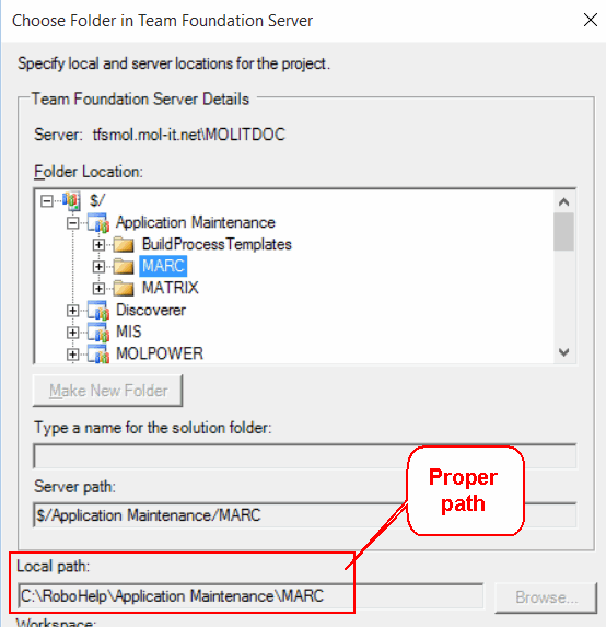 The other problem is that in other cases when I map a folder with Source Control Explorer and open a project with RH, the Local Path either defaults to C:\ or C:\WINDOWS\system32 instead of what I defined in the workspace. Plus this path is uneditable. However, it also creates a new workspace with a _1 extension to my existing workspace, in which I can edit the path, but I don't want an extra workspace.
