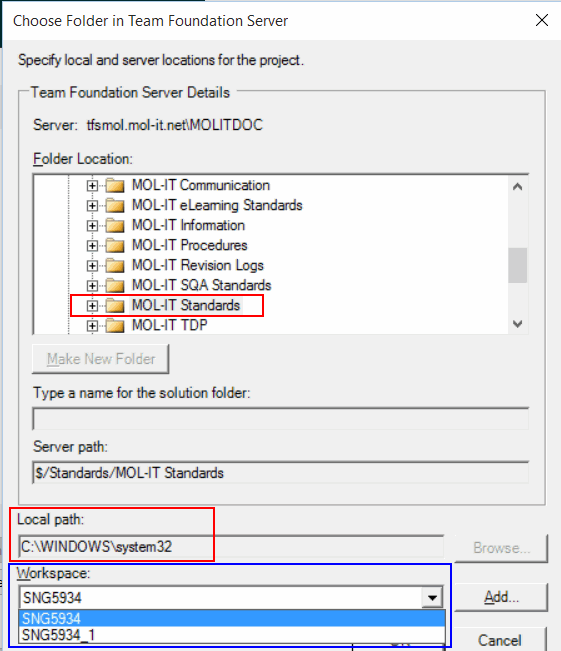 Local Path in TFS dialog either defaults uneditable to different folder or can't connect in Win 10