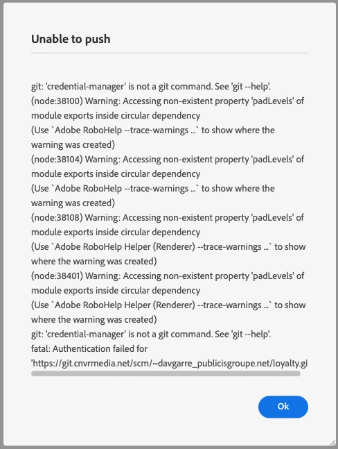 - That's as far as it gets. It hangs on Pushing Commit (I think) until I run out of patience, minutes or hours later. When I inevitably quit the headless instance of RoboHelp, I get a fairly large error message in the main instance that says Unable to push at the top and Authentication failed at the bottom.