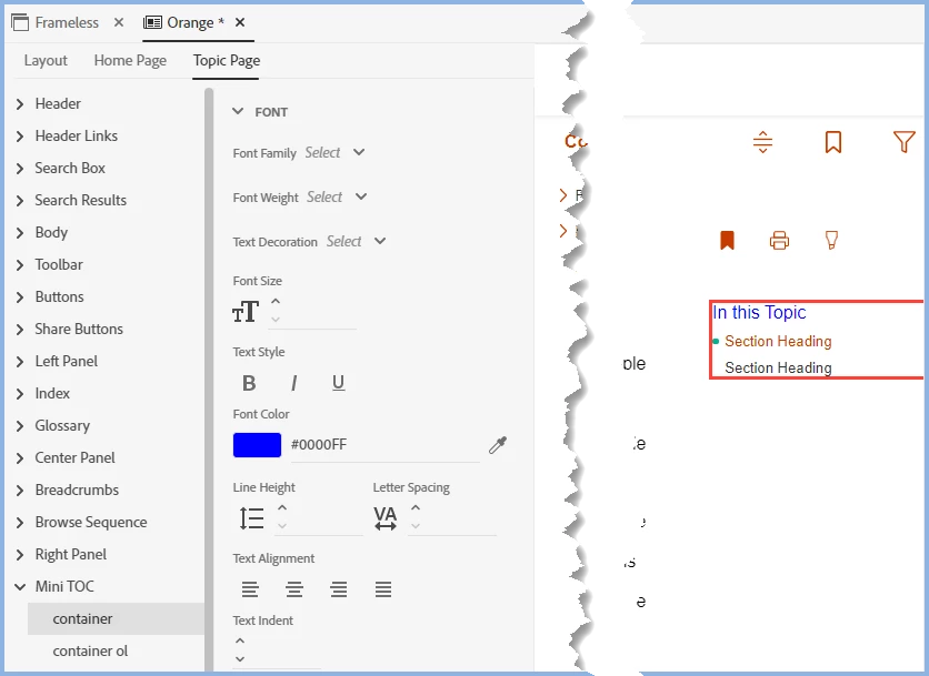 I'm trying to apply some styling to the Mini TOC caption but having no luck. In the skin, I see Topic Page > Mini TOC > caption, so that seems like the logical place to make changes. But nothing I do there (change the font, change the color, make it italic, etc) seems to have any effect in the output. I have successfully customized the settings for item, selected item, and the item-levels I need by using the Skin Editor, but not the caption.