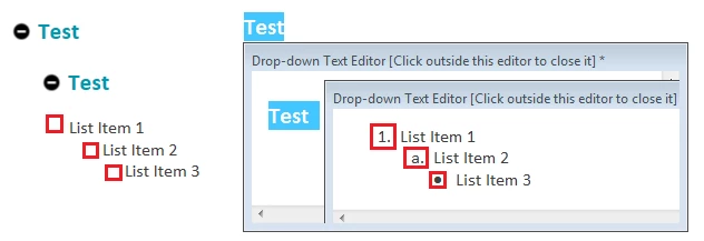 The known issue: The multilevel list styles work at the main topic level and inside the first-level dhtml drop-down text box. However, if we add a drop-down text box within a drop-down text box and apply a multilevel list style to text within the embedded dhtml drop-down text box, the topic appears fine on the design tab but loses the outline numbers and/or bullets in the preview and in the published version. Any idea what would cause the list not to display properly or how to get the multilevel list styles to work in this situation? (Yes, we know we can use list styles instead of multilevel list styles, but that is problematic, too)