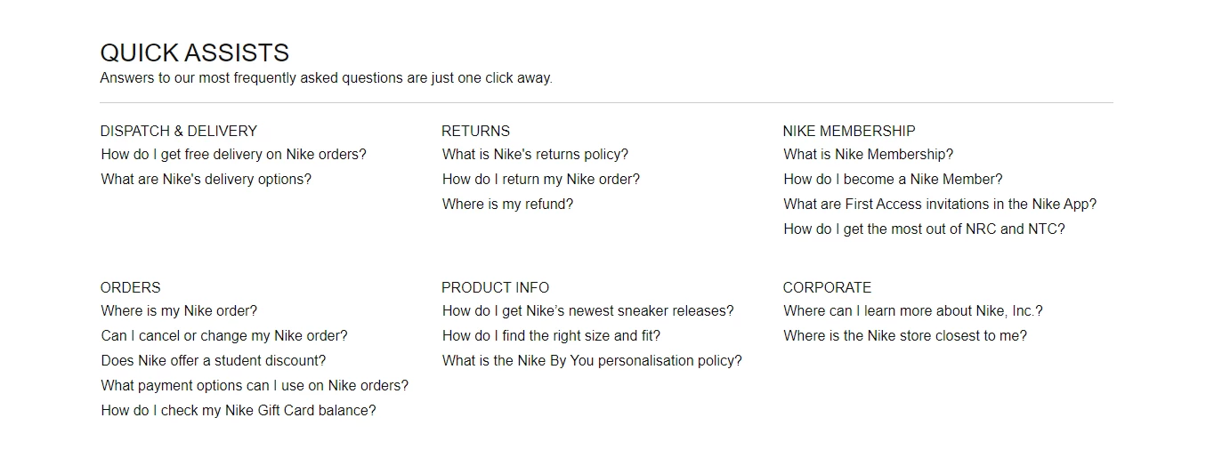 I'd like to create a section in a topic very similar to this example from Nike.com, whereby each link in each of the six sections is a drop-down that contains an answer to the question: