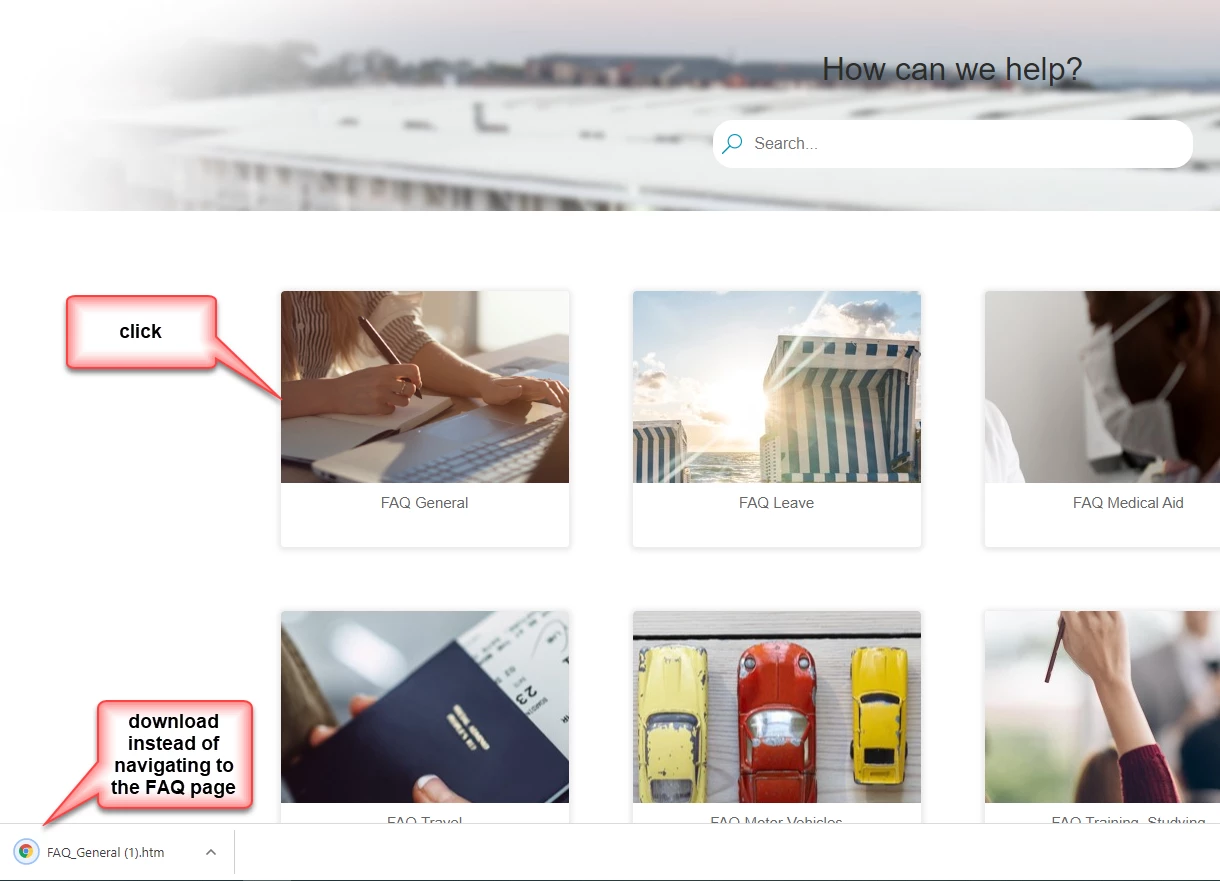 When I click on any microcontent tile on my homepage it doesn't navigate to the relevant microcontent page but downloads the *.htm file for the microcontent (which is unformatted and not userfriendly).