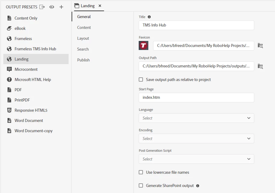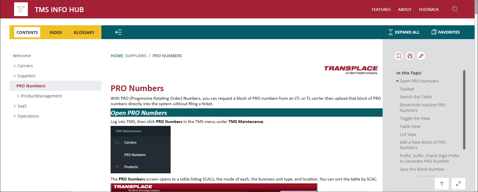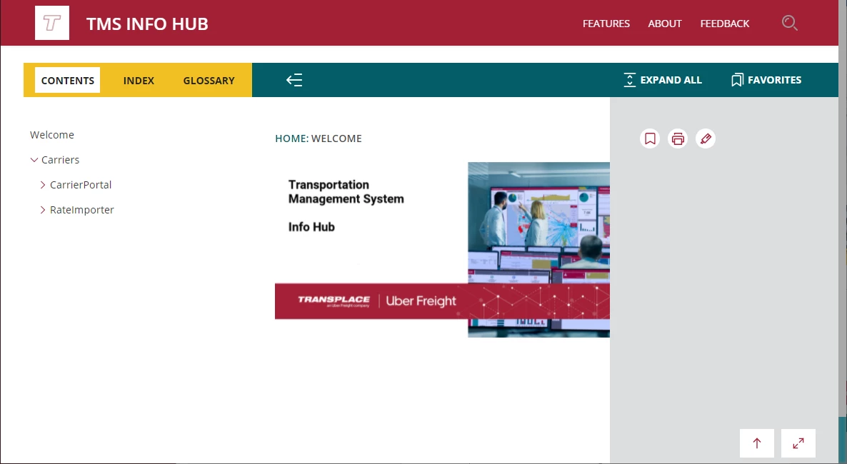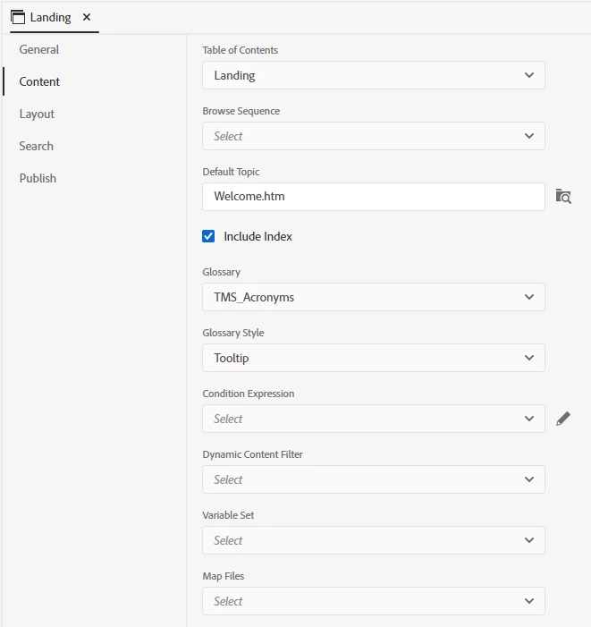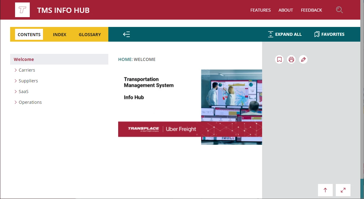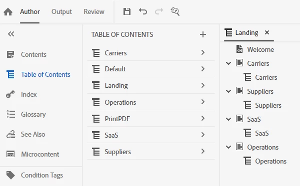 I created multiple tables of content. The primary TOC is called Landing. Landing has the Welcome topic page and four sections. The sections are Carriers, Suppliers, SaaS, and Operations. Each section has its own TOC.