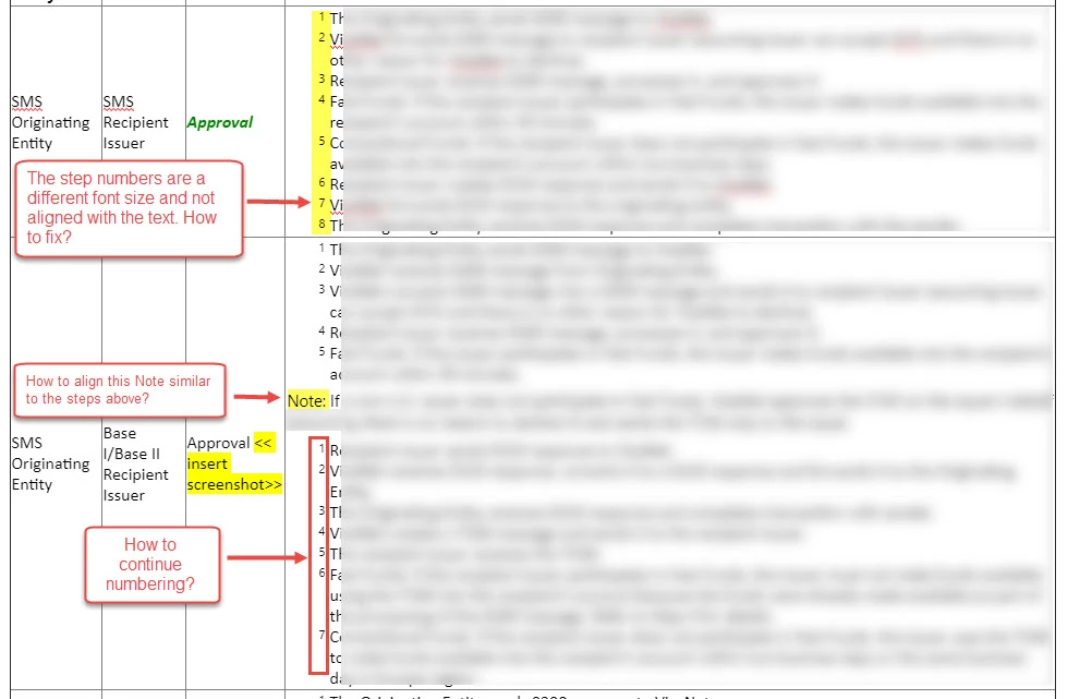 - When there's a Note in between the steps, I remove the numbering from it but I'm not able to align it with the numbered steps above the Note (screen #2).