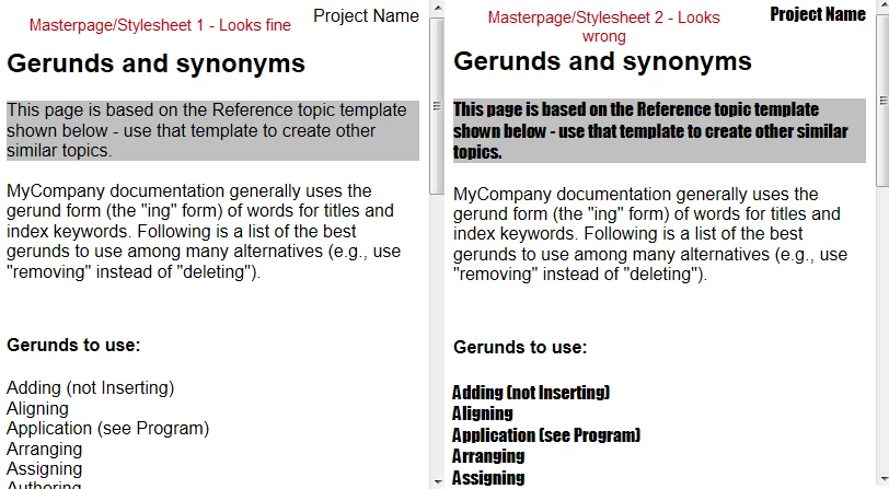 I have been using RH since 4.0 and am currently I have a RoboHelp HTML project where I am using two different style sheets. Each style sheet is associated with its own Master Page. I've done this because my client wants to eventually migrate to a new look. The 'Normal' style in both instances is mapped to a different font. I have ensured that the style sheet is attached and that all content is in the appropriate style. There is no issue with the first style sheet (and Master Page) I created. The 'new look' Master Page and Style Sheet have had random display issues with the Normal style; occasions where part of the topic displays or all content is not displaying.This is the case if I select View Selected Item from within the project and view the topic after compiling WebHelp.