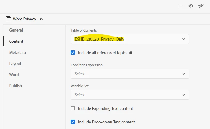 However, when I generate the output, it contains ALL of my topics. (It should only contain the one topic that's in the TOC, "28. Privacy")