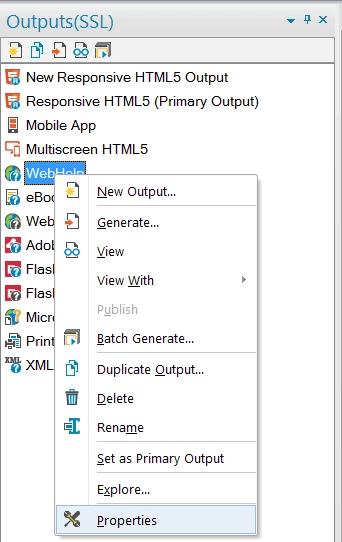 When I right-click on the WebHelp layout in the Output section, it doesn't show Settings or Properties option to set.