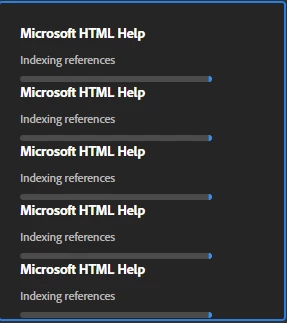 When I output a HTML Help with ±100 topics, it generates in ±10s (I see the time change in Explorer), but RH keeps showing the progress bar generating the output with the text 'indexing references'.