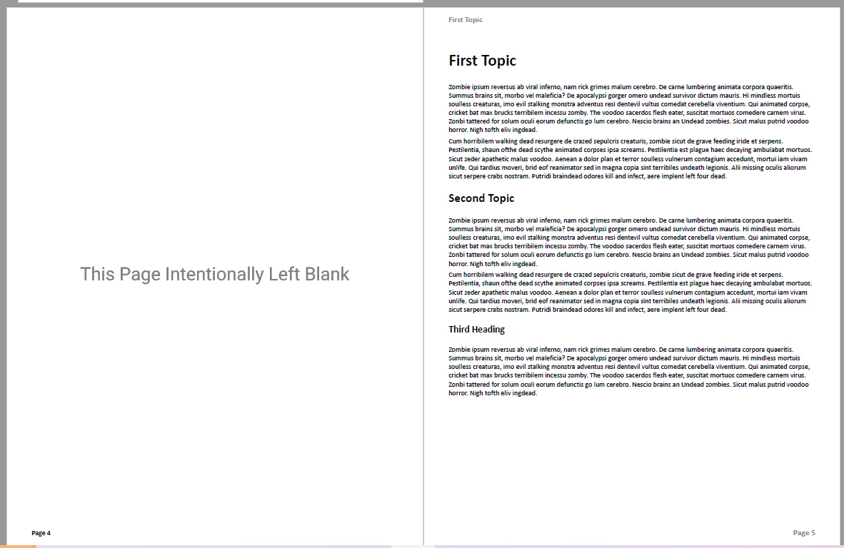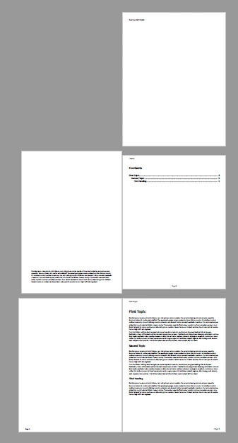 • Since I have my chapters start from an Odd page, it inserts a blank page ahead of the topic so instead of it being the 2nd page of the document and showing up on the left, it is now on the right side of a dual layout and inserting blank pages where they are not wanted.
