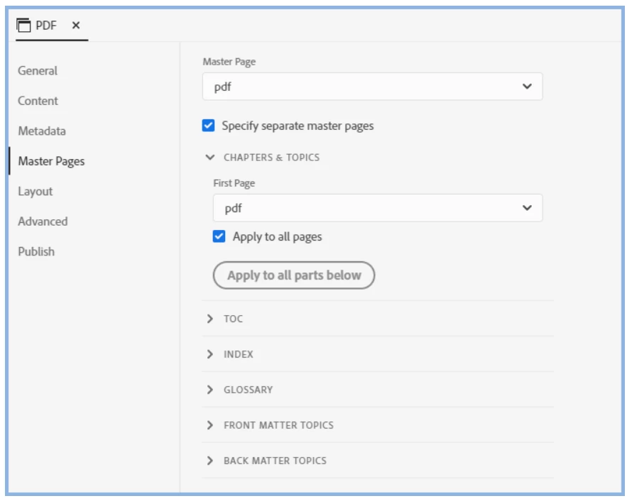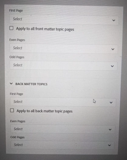 In the 2020 version, you can apply master pages to each section and Chapters and Topics are different than Front and Back Matter. This image courtesy of your 2020 outputs documentation page.