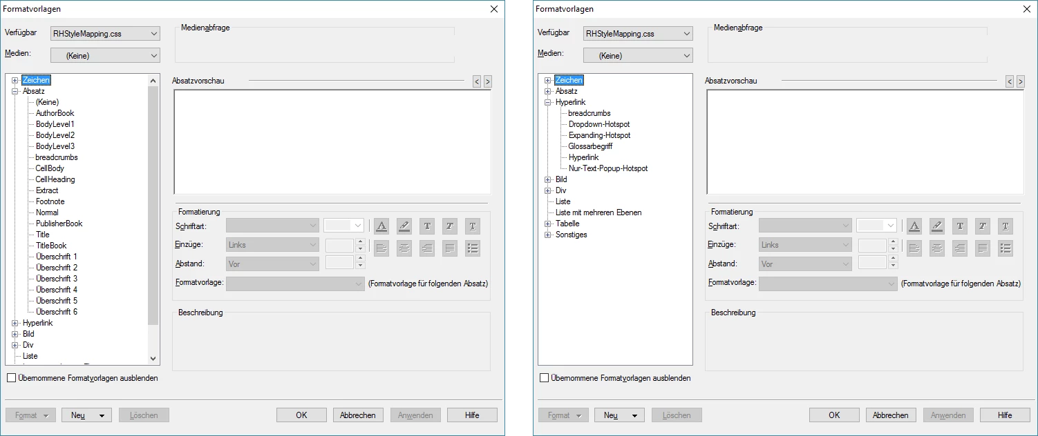 I am trying to convert FM paragraph styles in my help to dropdown captions and dropdown texts in RH, but in the CSS and the style mapping dialog, there are no appropriate styles to choose. I know that the dropdown styles exist in the English version of RH, but for some reason they must have gone missing in the German version. I only found the Hyperlink styles for Dropdown-Hotspots, but I can't map those to my FM styles – I am not sure if this would be the right way to go about this anyway.