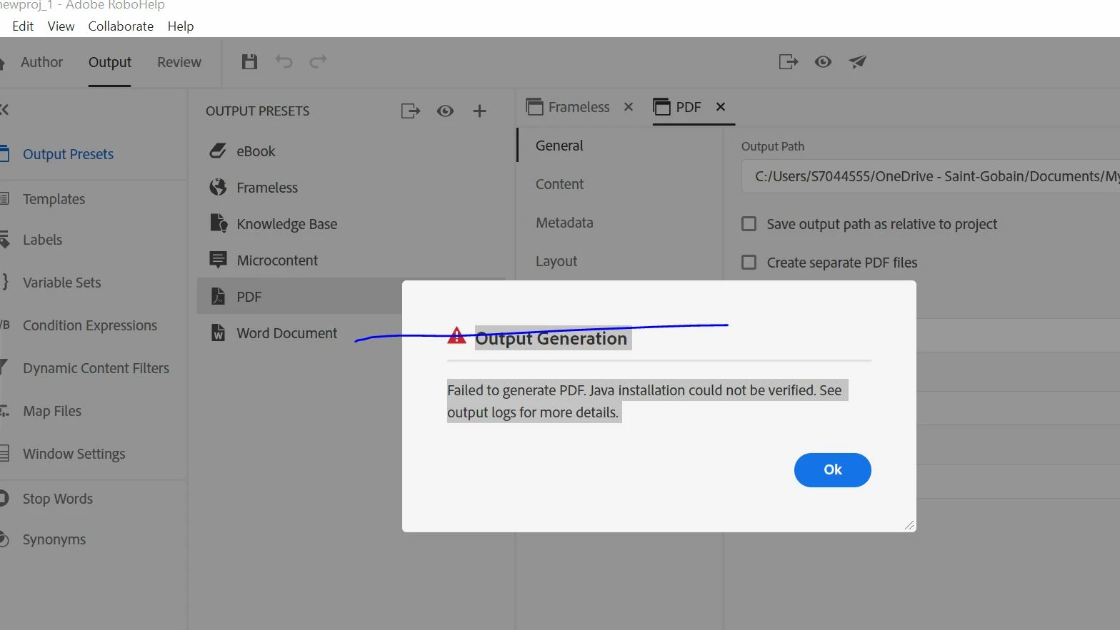 when I try to generate PDF output for my topic in my RoboHelp platform , I keep getting a java installation error even after installing the required java updates for the RoboHelp and also tried uninstalling the RoboHelp but