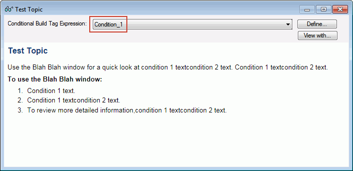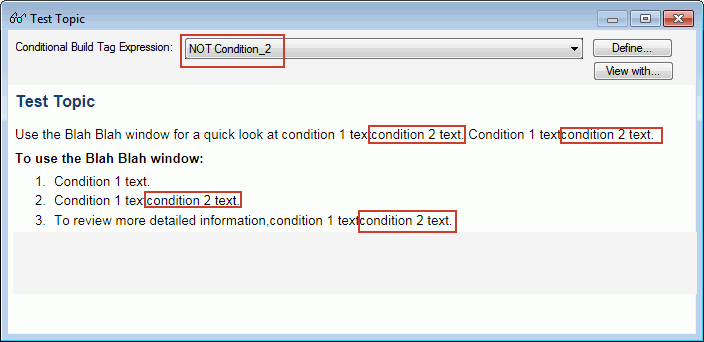 In RBH 11.04.291, I am previewing a topic with two type of conditional text using the binoculars. I set the Conditional Build Tag Expression to one or the other, but regardless of my selection, the other conditional text remains.