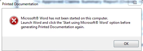 I am using RoboHelp 11 HTML version 11.0.0.179, my operating system is Windows 7 Professional. I am trying to generate either a Word or a PDF file but I am getting the following error: "Microsoft® Word has not been started on this computer. Launch Word and click the 'Start using Microsoft® Word' option before generating Printed Documentation again."