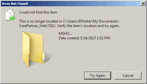 This generated an error message when I moved a copy of the project to a backup drive. Then I tried to delete the MSHO... folder from the !SSL! folder on my local drive, but I get an "Item Not Found" message (see below), and I was unable to delete that folder. I have been able to delete the Word document inside the MSHO... folder.