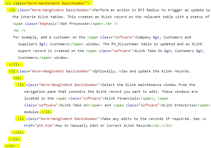 After upgrading to RoboHelp 2020, all of the numbers and bullets from my multi-level lists have vanished. I know this is because we have changed the way that style sheets and code works in RoboHelp 2020 to a better method. However, is there a script or fix available from Adobe that can help fix this problem and insert the li, ol and ul codes that are required for lists? The only way I can seee to fix it is by doing something like the following but I don't want to have to do this maually to thousands of topics.