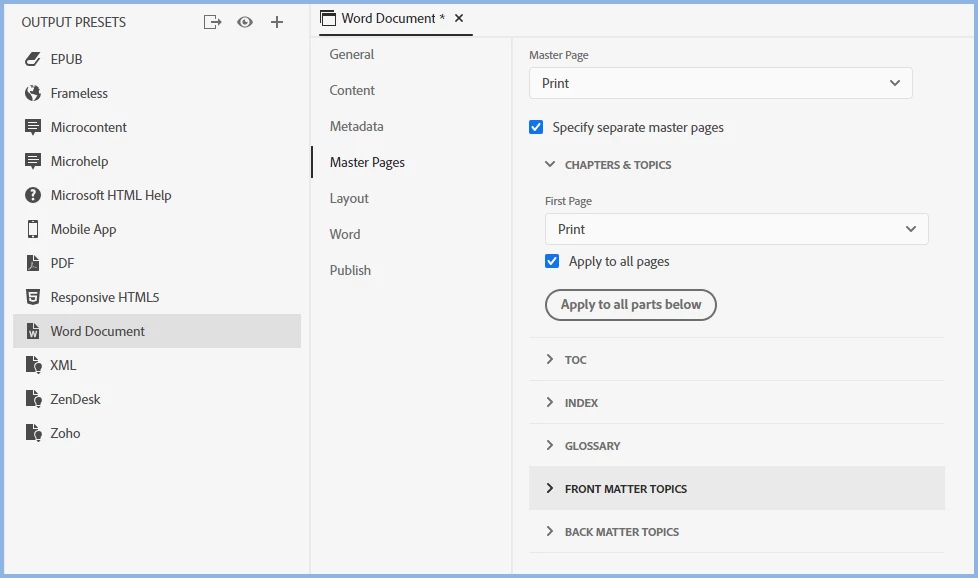 3/ I create a masterpage in content menu and add it as firts page in the word output model ToC