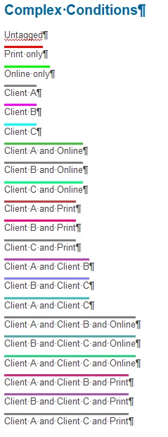 • Any text that is tagged with Online only (therefore excluding text that is tagged with Online and Client B or Online and Client C). >> This is where my condition expression ceases to work... Text with Online only is hidden in the output.