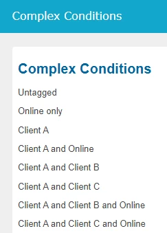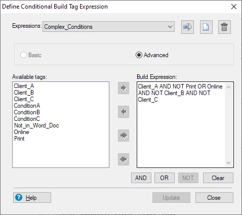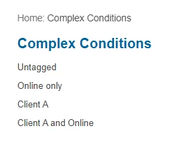 I have successfully built a condition expression that includes all the text tagged Client A, whether alone or in combination with another Clients tag or with the Online tag, and excluded any text tagged with Print. Which is almost what I want.