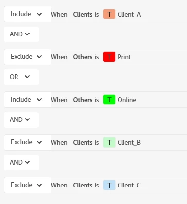 For example "NOT Client_B AND NOT Print" and "Exclude Client_B AND Exclude Print" produce the same thing - it excludes anything tagged with either Client B or Print.