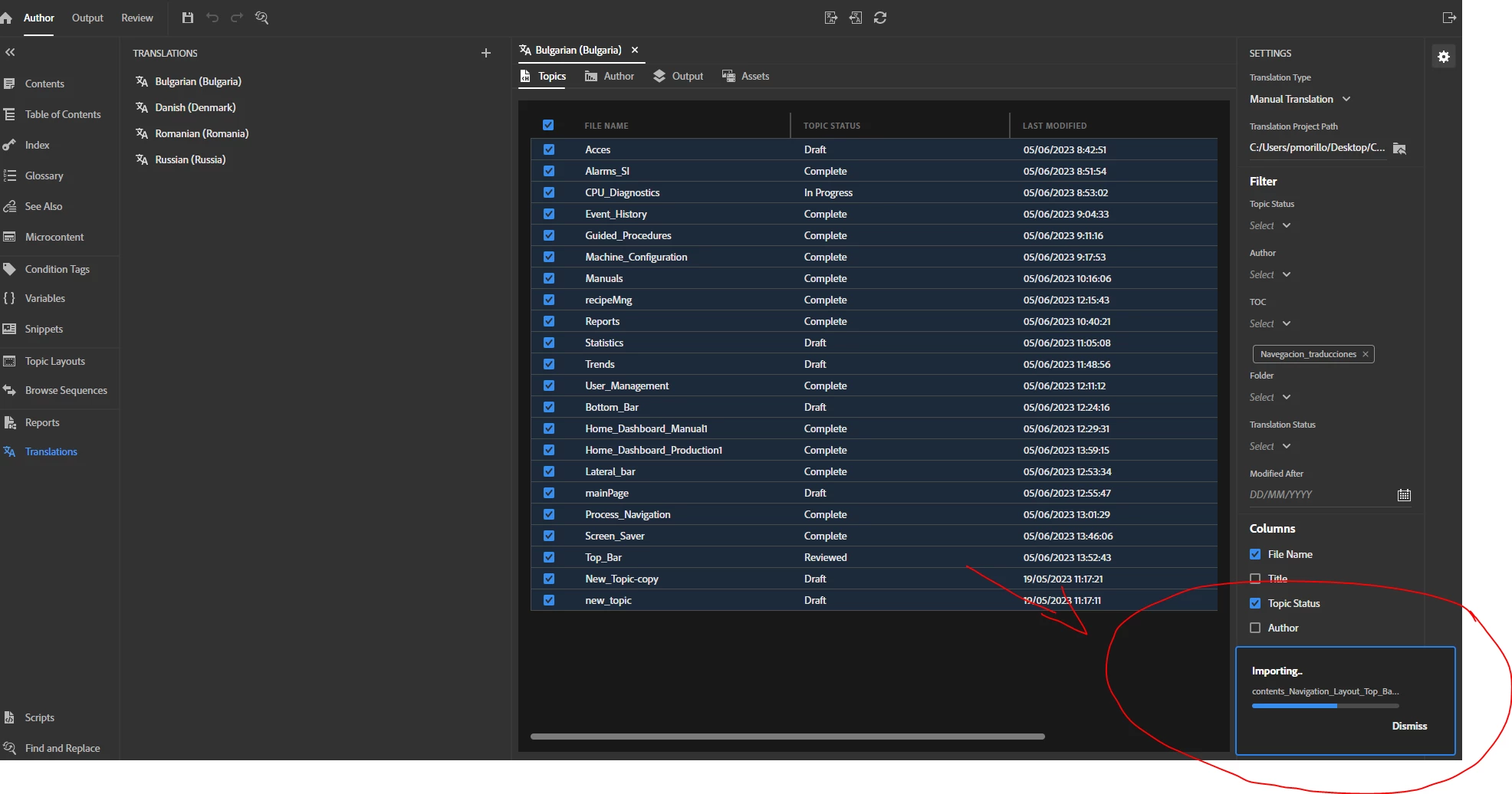 Hello, I export the files that I want to translate, a company sent them back to me translated, I change the translated files for the original ones without modifying the mapperFile, I only replace the topics.