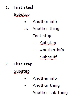 I created a multilevel list in Robohelp for procedures to help with this need. I set up this list that has a mixture of bullets/numbers, and nothing in front in order to have a procedure in a topic with images to go along with it (that of course don't break the numbering system, and aren't numbered themselves, because it looks a bit odd to just have a step numbered picture).
