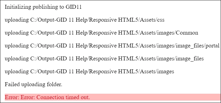 I am trying to publish Responsive HTML5 output to our FTP server. I successfully generated output but when I try to publish it, the following message remains there: