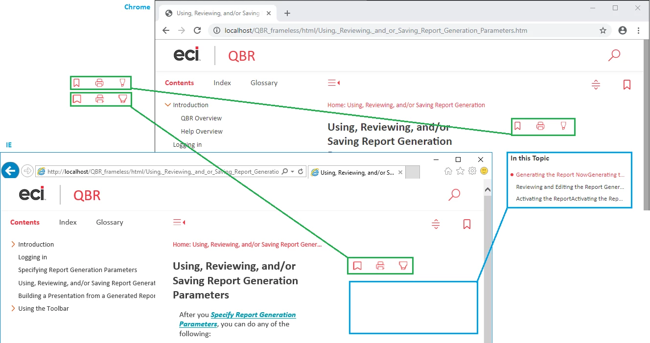 Chrome appears to display the content well (duplication issue aside). IE does not display the "In This Topic" region. IE also appears to stretch some of the icons horizontally (almost as if forcing them to be "square"). The icons still work, but the "Print" icon in particular appears distorted, missing lines of pixels on the right and bottom edges.