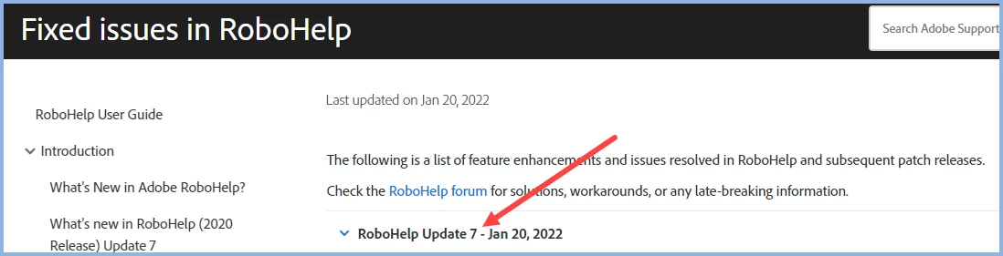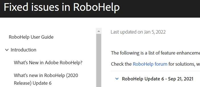 Thank you Peter for telling this. I indeed see it when I check for updates from the RoboHelp menu. The what's new text shows the link https://helpx.adobe.com/robohelp/kb/fixed-issues.html to see details, but these are not yet available. I guess that we just have to wait a while for the details to be published.