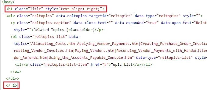 Note that the closing h1 tag appears at the end of the list (as expected). In the lists that were not correctly formatted, the closing h1 tag appeared immediately after the opening h1 tag (causing the right-alignment formatting not to be applied to the topics in the list). When I noticed the difference in formatting, I started manually correcting the lists where the topics were left-aligned (thinking I had inadvertently caused the problem with some of the lists). After a while, I noticed that topics I had corrected to use the right-alignment were again using the left alignment. I fixed the html code in a topic. I clicked the Author (pencil) icon to display the author view. I clicked the Source icon to display the code view and noticed that the system had reformatted the h1 tag to move the closing h1 tag above the list again (with an added br tag):