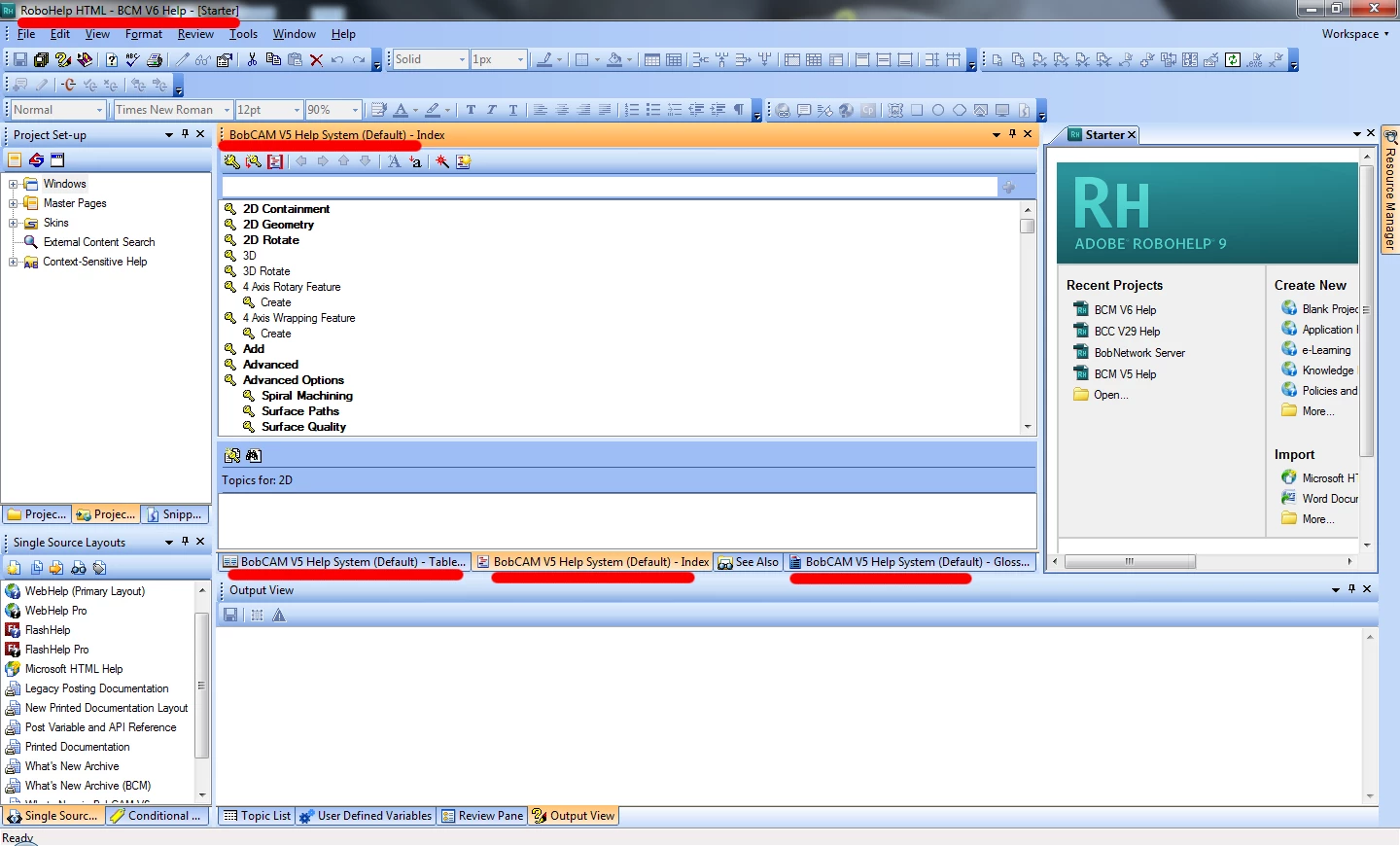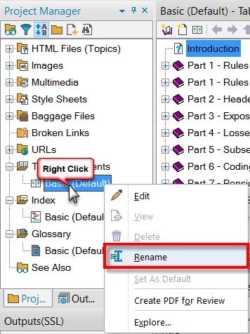 Hey guys! I'm having an issue trying to rename the panes in my project in Robohelp 9. I have the project itself renamed (as you can see in the top left)... I finally figured out how to rename the window that is output in the .chm (Project Set-up > Local Window > Properties), but I still have all these panes in the project with the wrong name. Does anyone know how to update those?