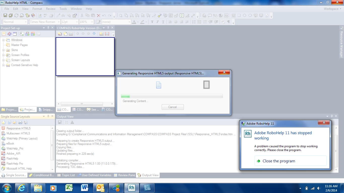 I recently upgraded from RoboHelp 10 to 11. I would like to take advantage of the new layouts, but I receive an error message when trying to generate the layouts. RoboHelp actually closes as the layouts are generating. Anyone else experiencing this error?