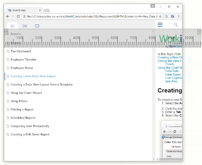 When I resize the browser window in Chrome or Firefox to less than 950 pixels the TOC expands and the topic pane shrinks and becomes unreadable. Unreadable might not be a tremendous problem since we are attempting to navigate away from that topic, but the TOC growing to dominate the browser window seems unnecessary and distracting. In Internet Explorer, the TOC starts out immediately dominating the browser as shown in the second figure below.