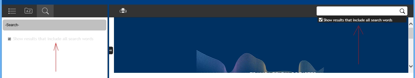 The "Use AND search option" is enabled and displays the text "Show results that include all search words" on the Search Tab and Function Bar. But the text is displayed in grey on the Search tab and is virtually unreadable.