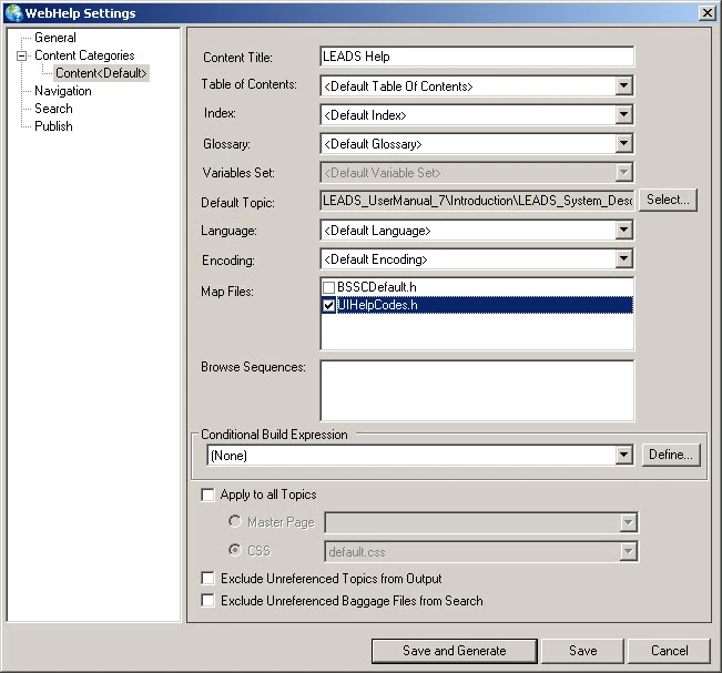The settings for generating the WebHelp output are shown below, and the "UIHelpCodes.h" file is selected as the map file. The topic exists properly in the TOC and in the generated output. It also is shown to link in the whcsdata.js file: