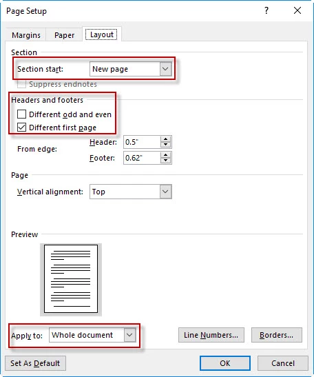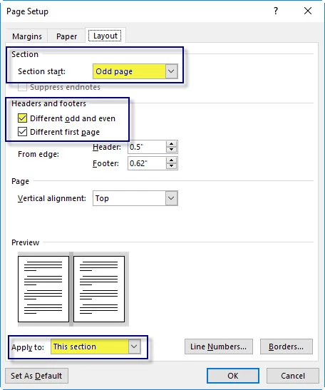 BEFORE (Settings in my Word Template Layout tab > Page Setup > Layout Tab).
