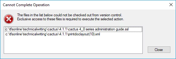 Checking in and out works as expected for ALL files EXCEPT after I generate one of the Printed Documentation Outputs (Word or PDF). As soon as I begin generating the output, I get this dialog: