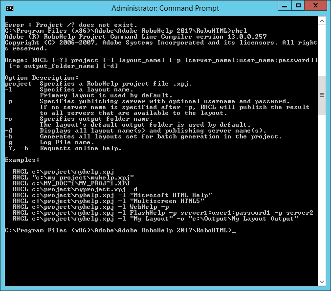 Example: When we run the command line “C:\Program Files (x86)\Adobe\Adobe RoboHelp 2017\RoboHTML\rhcl.exe" "X:\doc_4x\html\apps\projects\sn\fsn32.xpj" -l "MyHTML5" -o "X:\doc_4x\html\apps\projects\sn\!SSL!\HTML5\Product\6100" -g "X:\bldtools\logs\fsn32-HTML5.log"