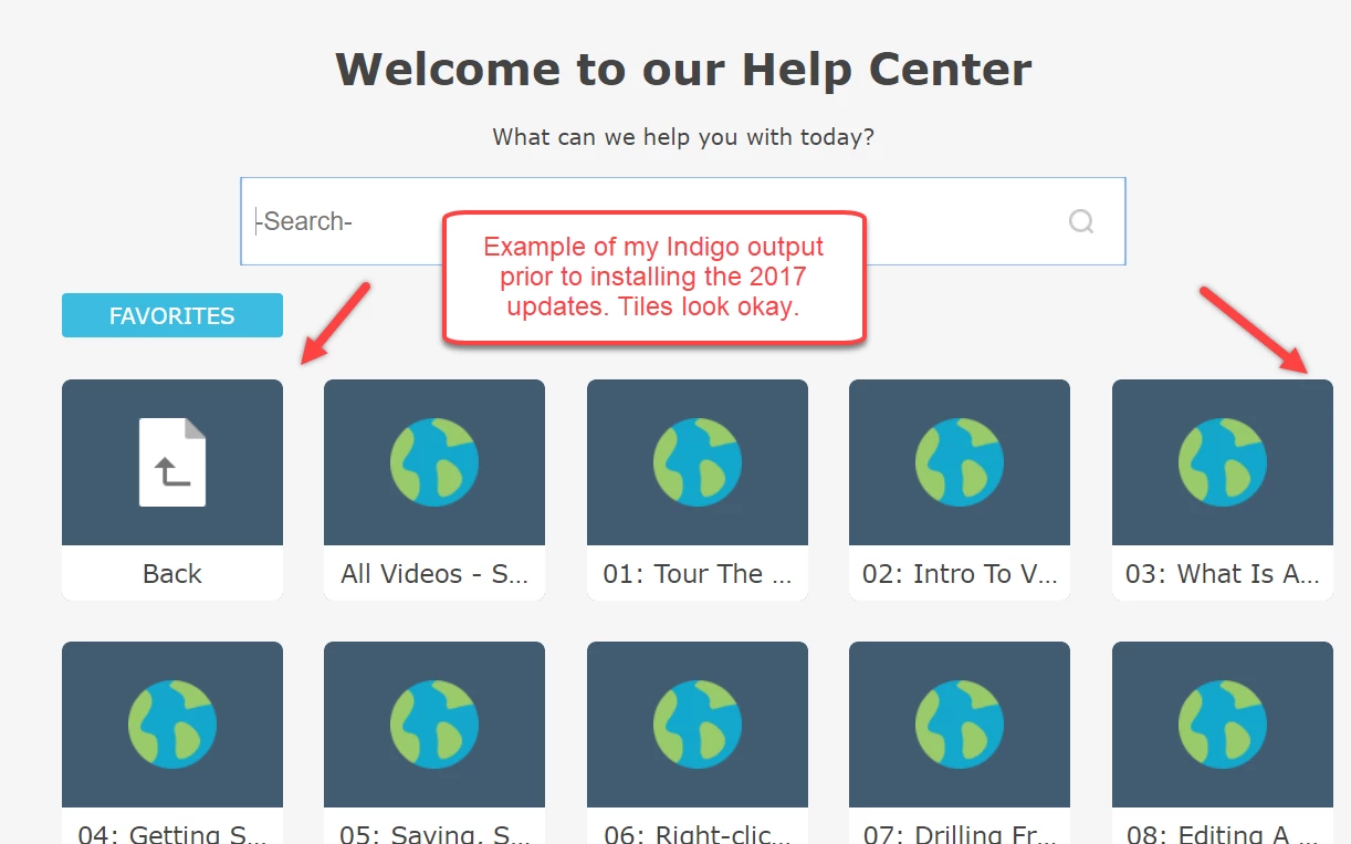 Has anyone experienced the following in Indigo output for responsive help? I have a book in table of contents which has a list of topics underneath it. In the Indigo layout, when I click the tile that corresponds to this toc book (named Video Resources in my example images), I see tiles for each topic but those topic tiles are cut off on the right side of the browser. This 'cut off' issue didn't happen in RH 2017 prior to my installing Updates released by Adobe. Prior to the Updates, the Back button used to be in line with other tiles and all topic tiles fit in browser window. After the updates, the Back button displays on its own line above other tiles. It seems like the Back button being on it's own line created a shift in the tiles below it or caused something to be off with how the page renders?