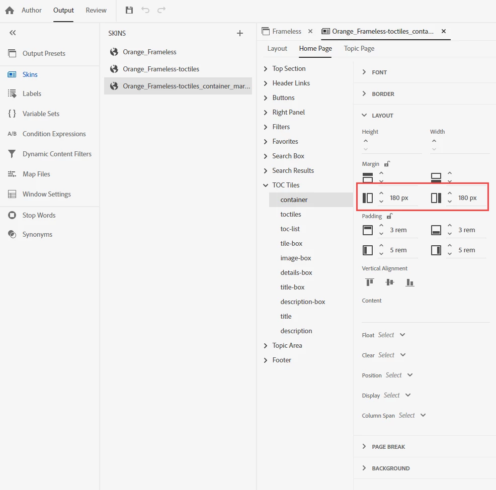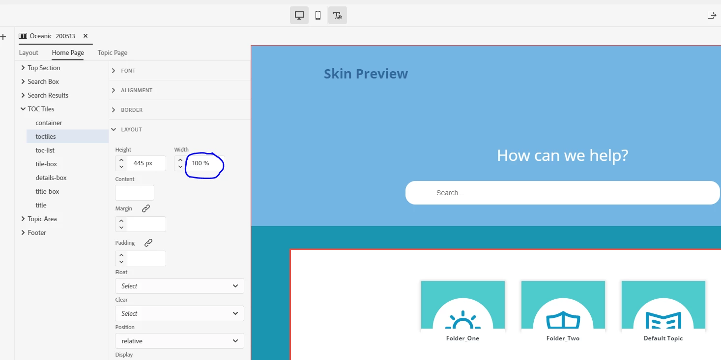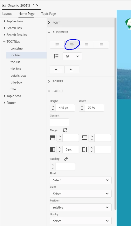 I'm in RH 2019 (new UI) trying to center the TOC tiles area on the home page of a frameless skin (Oceanic).