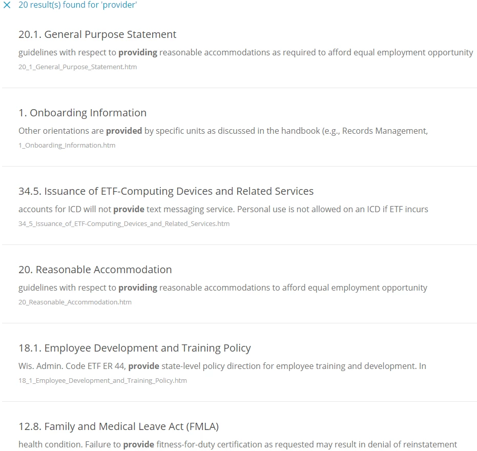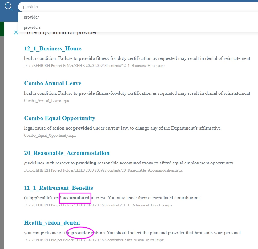 In RH 2019, new UI, frameless output, search is performing poorly. The search results return way too many similar words (including some far-flung words), and the exact match is not prioritized (screenshot, below).