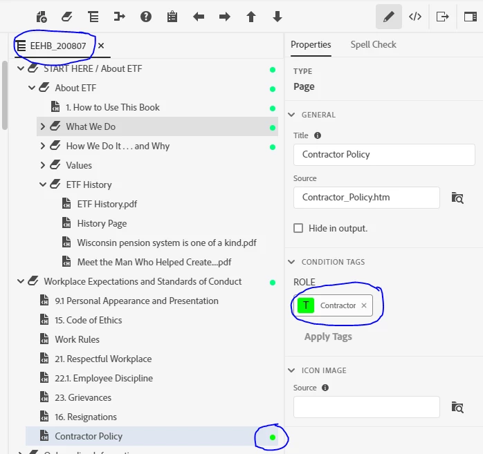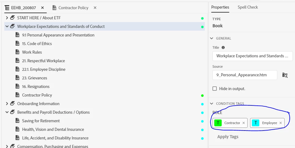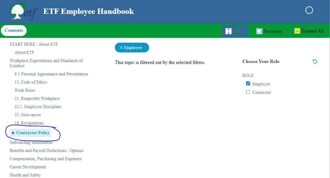 In RH 2019, new UI (frameless), when my end user chooses to filter for the "Employee" role, the DCF properly filters out the topic "Contractor Policy." However, the topic title "Contractor Policy" remains visible in the main TOC (please see screenshot, below).