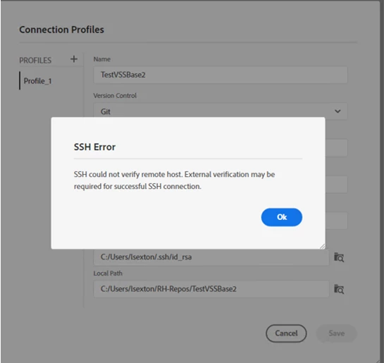 Followed all of our documented steps, worked with Adobe Tech Support and still cannot determine the issue. Note when copied over the ssh keys from user's original computer to the new one then RH works as expected and user can create new connection profiles. But, when using the newly created ssh keys consistently get the following error when trying to create connection profiles. Any ideas how to fix?