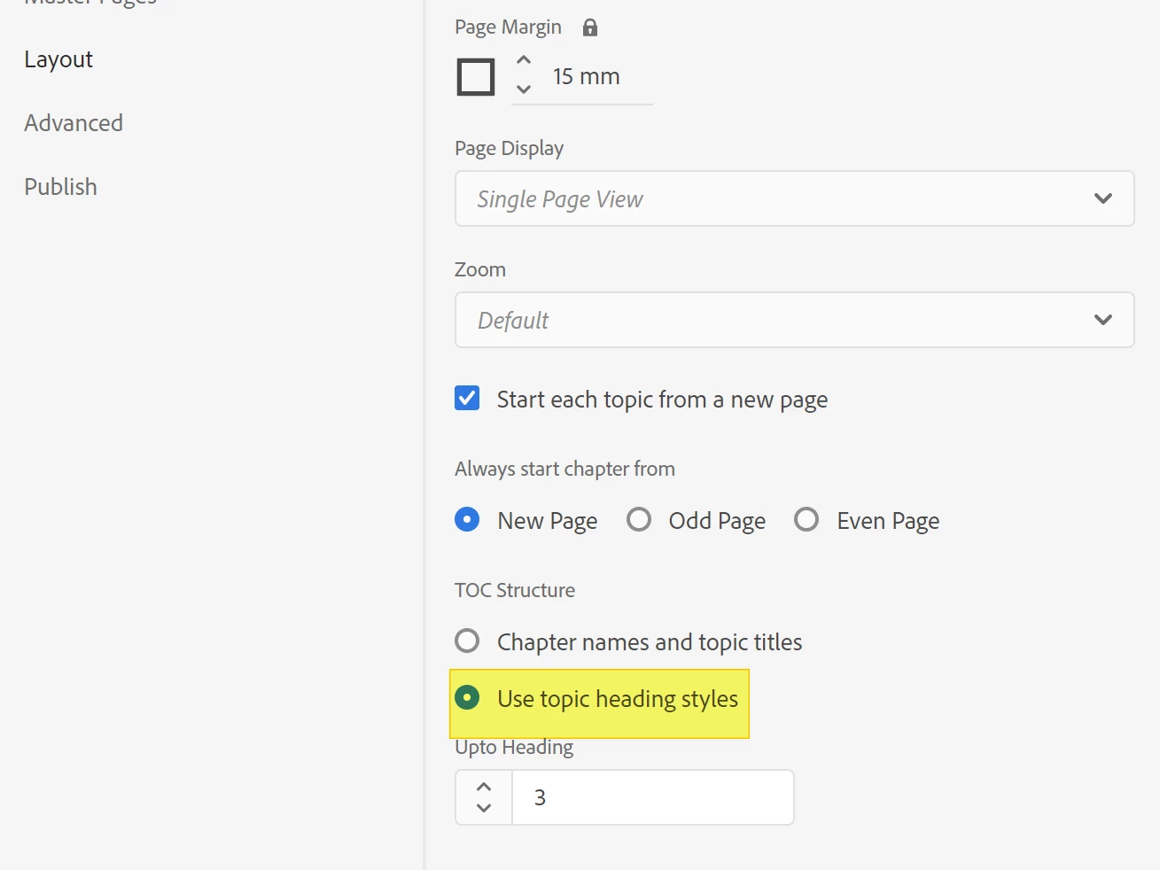 - In Layout, set TOC structure to Chapter names and topic titles.